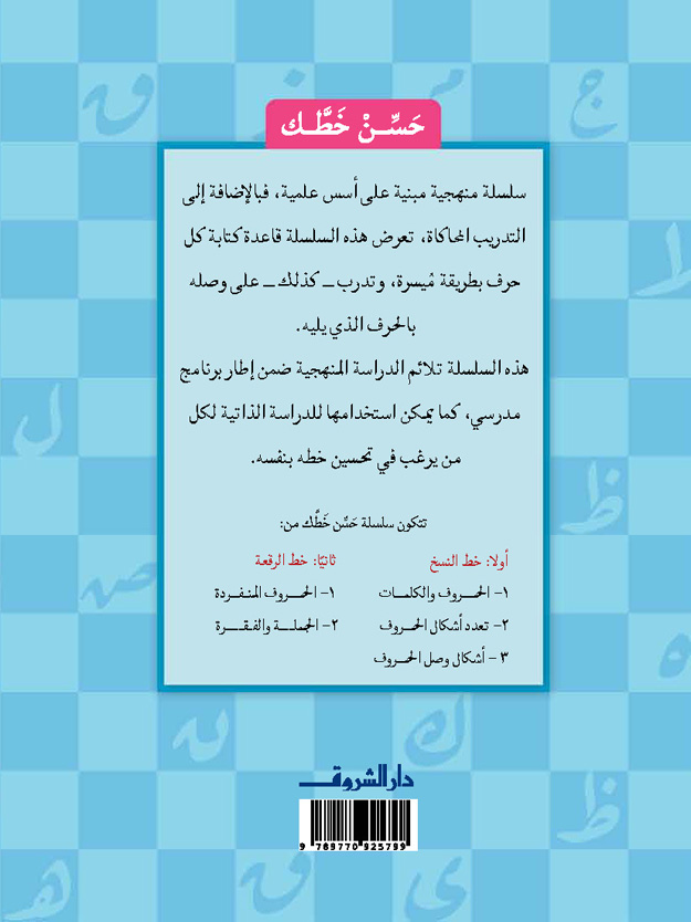 The “Improve Your Handwriting” series is a systematic series built on scientific foundations. In addition to training students to write Arabic script correctly, it presents the rule for writing each letter in an easy way and trains them to connect it to the following letter. The series is suitable for school study, and it can also be used for self-study by anyone who wants to improve their handwriting on their own.