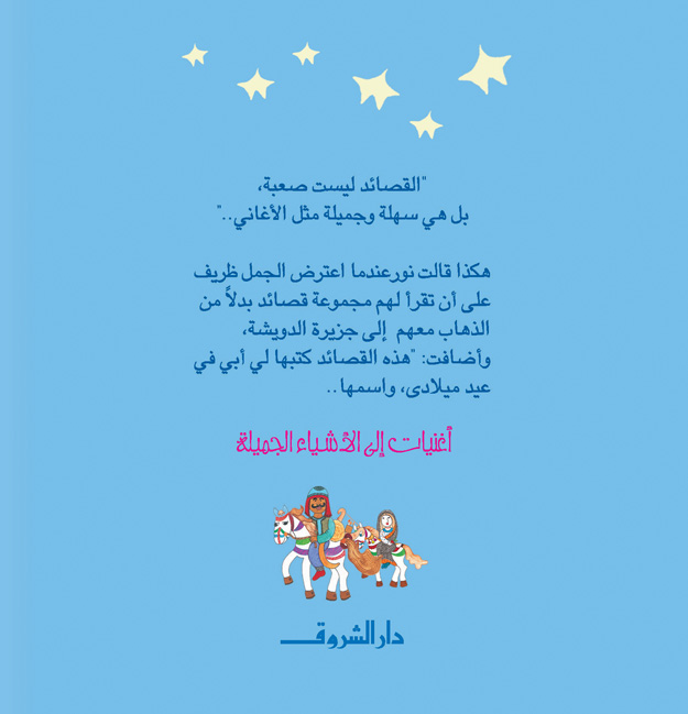 “Poems are not difficult; they are easy and beautiful, like songs,” Nour said when Zarif the camel objected to her reading them a collection of poems instead of going with them to Duweisha Island. She added, “My father wrote these poems for me on my birthday, and they are called Songs to Beautiful Things.” This is a collection of gentle poems by Dr. Abdel Wahab El-Messiri, in which he contemplates the world of children, the colors and scenes around them, and the thoughts and feelings within them.