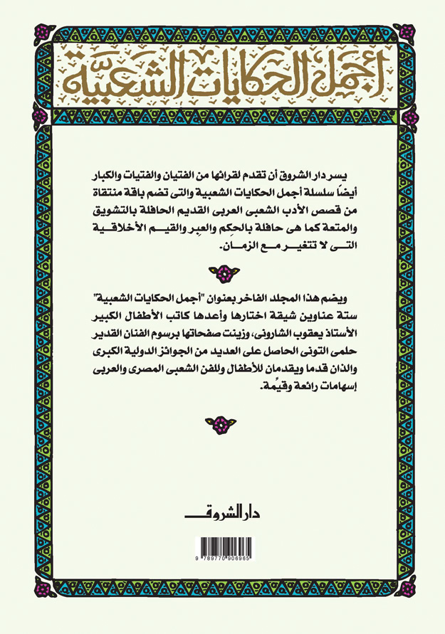 هذا الكتاب البديعُ يضم باقة مُنتقاة من قصص الأدب الشعبي العربي القديم، الحافلة بالتشويق والمتعة، كما هي حافلة بالحِكَم والعِبر والقِيم التي لا تتغير مع الزمن. اختار كاتبُ الأطفال الكبير يعقوب الشاروني ستَّ حكايات شعبية؛ مثل "الشاطر حسن"، و"البئر العجيبة"، ووضعها بلُغته السلِسة، وزُينت صفحاتُها برسوم الفنان القدير حلمي التوني، فأصبح هذا الكتابُ إضافة قيمة لمكتبة القارئ العربي.