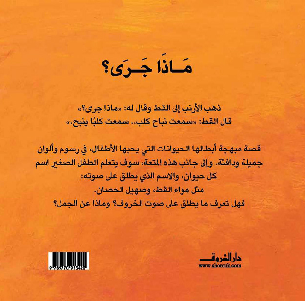 رفع الأرنب رأسه وقال: "أسمع مواءَ قط!"، وركض ليرى ماذا جرى، فذهب للقط وسأله: "ماذا جرى؟"، وانطلقت الحيوانات في مهمة جادة للغاية لاكتشاف ماذا جرى بالضبط. قصة مَرحة عن الحيوانات وأصواتها. سلسلة من خمسة عناوين تقدم معلومات علمية ولغوية عن الحيوانات في صيغة حكاية لطيفة. تُزود الطفلَ بمعلومات مختلفة عن الحيوانات؛ مثل: أسماء بيوتها، أو أصواتها، أو صغارها. تتميز هذه السلسلةُ بلُغتها البسيطة التي تُتيح للأهل قراءة السلسلة للأطفال الصغار جدًّا، وتُتيح للأطفال المتمكنين من القراءة الاستمتاعَ بها وحدهم.
