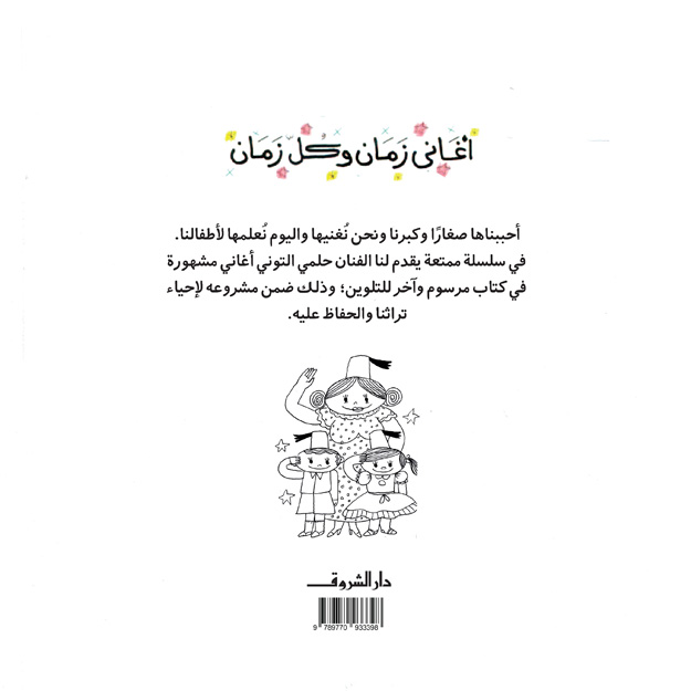 أغاني زمان وكل زمان، أحببناها صغارًا وكبرنا ونحن نغنيها، واليوم نُعلمها لأطفالنا. في هذه السلسلة الممتعة يقدم لنا الفنان حلمي التوني اختيارات من أغانٍ تراثية مصرية مشهورة في كتاب مرسوم وآخر للتلوين، وذلك ضمن مشروعه لإحياء تراثنا والحفاظ عليه.