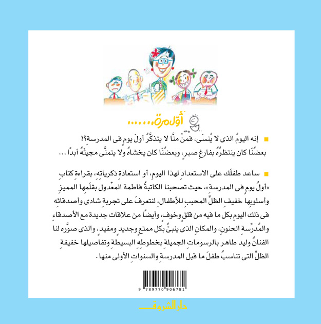 إنه اليوم الذي لا يُنسى، فمَن منا لا يتذكر أولَ يوم في المدرسة؟ بعضنا كان ينتظره بفارغ صبر، وبعضنا كان يخشاه ولا يتمنى مَجيئه أبدًا. ساعِد طفلك على الاستعداد لهذا اليوم، أو استعادة ذكرياته، مع هذا الكتاب اللطيف، فنتعرف على تجربة شادي وأصدقائه في ذلك اليوم بكل ما فيه من قلق وخوف وحماس وتشوق. نرى شادي وهو يبني علاقات جديدة مع الأصدقاء والمُدرِّسة الحنون، ونكتشف معه المكان الجديد الذي يُنبئ بكل مُمتع ومُفيد.
