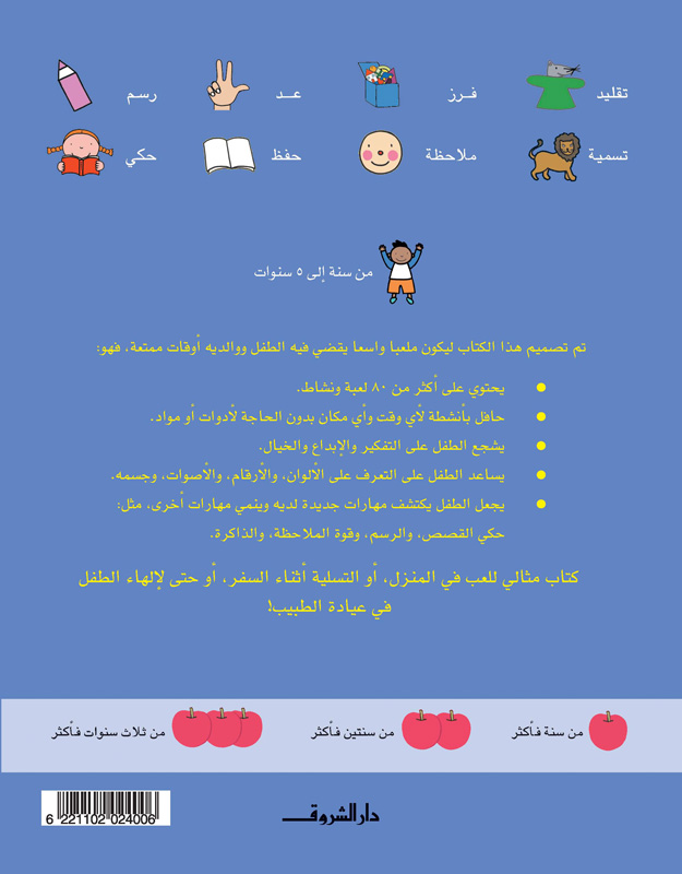 صُمم هذا الكتابُ ليكون ملعبًا واسعًا يقضي فيه الطفل ووالِداه أوقاتٍ مُمتعة، فهو يحتوي على أكثر من 80 لعبة ونشاطًا تصلح لأي وقت وأي مكان بدون الحاجة لأدوات أو استعدادات، وهو يشجع الطفل على التفكير الإبداعي وإطلاق العنان لخياله، كما يساعد الطفل على التعرف على الألوان والأرقام والأصوات والعالم من حوله. هذا الكتاب المسلّي يُنمي مهارات مختلفة لدى الطفل مثل حكي القصص، والرسم، وقوة الملاحظة، وتقوية الذاكرة. كتابٌ مِثاليّ للعب في المنزل، أو التسلية أثناء السفر، أو حتى لإلهاء الطفل في عيادة الطبيب!