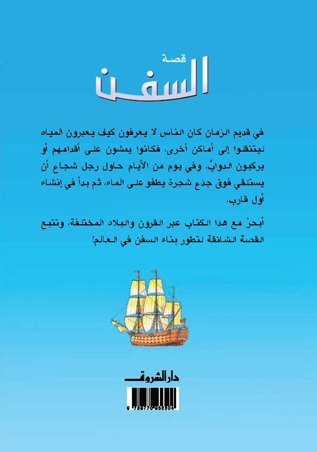 في قديم الزمان، كان الناسُ لا يعرفون كيف يَعبُرون المياه ليتنقلوا إلى أماكن أخرى، فكانوا يمشون على أقدامهم أو يركبون الدواب، وفي يوم من الأيام حاول رجلٌ شجاع أن يستلقي فوق جذع شجرة يطفو على الماء، ثم بدأ في صُنع أول قارب. أبْحِرْ مع هذا الكتاب عبر القرون والبلاد المختلفة، وتتبع القصة الشائقة لتطور بناء السفن حول العالم.