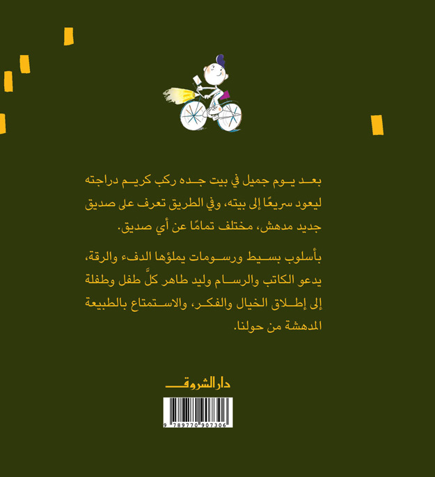 بعد يومٍ جميل في بيت جده، ركبَ كريم دراجته ليعود سريعًا إلى بيته. وفي الطريق تعرّف على صديق جديد مُدهش، مختلف عن أي صديق قابله من قبل! بأسلوب بسيط ورسومات يملؤها الدفء والدقة، يدعو الكاتبُ والرسام وليد طاهر كل طفل وطفلة إلى إطلاق خيالهم وأفكارهم، والاستمتاع بالطبيعة البديعة من حولنا.