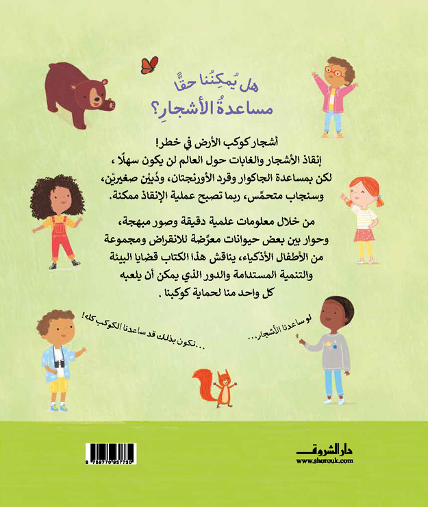 أشجار كوكب الأرض في خطر! إنقاذ الأشجار والغابات حول العالم لن يكون سهلًا، لكن بمساعدة الجاكوار وقرد الأورنجتان، ودُبّين صغيرين، وسنجاب مُتحمّس، ربما تصبح عملية الإنقاذ ممكنة. من خلال معلومات علمية دقيقة وصور مُبهجة، وحوار بين بعض الحيوانات المعرّضة للانقراض ومجموعة من الأطفال الأذكياء، يناقش هذا الكتاب قضايا البيئة والتنمية المستدامَة، والدور الذي يمكن أن يلعبه كل واحد منا لحماية كوكبنا.