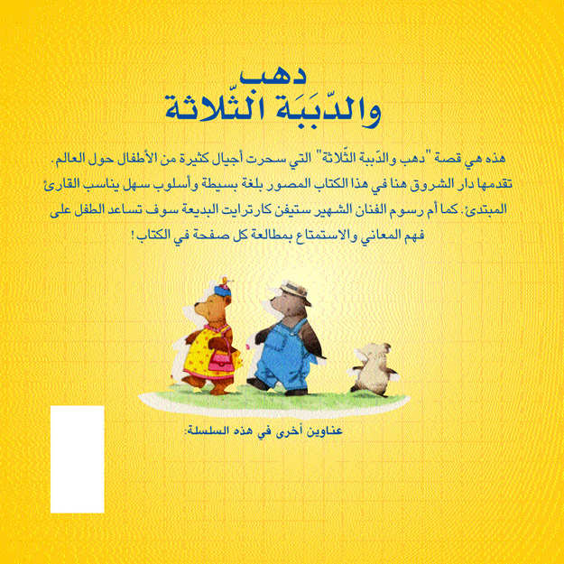 هذه قصة دهب والدببة الثلاث التي سحرت أجيالًا كثيرة من الأطفال حول العالم. قصة مُصوَّرة بلُغة بسيطة وأسلوب سهل يناسب القارئ المبتدئ. تتميز هذه السلسلة بأسلوبها المبتكَر في التدريب على القراءة، ففي أعلى كل صفحة هناك جُملة بسيطة يمكن للطفل أن يقرأها بنفسه ويتابع من خلالها القصة، وفي أسفل كل صفحة جملة أصعب قليلًا يقرؤها الأهلُ للطفل، أو يقرؤها هو عندما يصبح متمكنًا من القراءة. كما يمكن للطفل الذي لم يتعلم القراءة بعد أن يتابع أحداث القصة بسهولة من خلال الصور، فرسوم الفنان الشهير "ستيفن كارترايت" البديعة سوف تساعدُ الطفلَ على فَهْم المعاني والاستمتاع بالقصة، ولا تنسَ أن تبحث في كل صفحة عن البطة الصفراء الصغيرة!